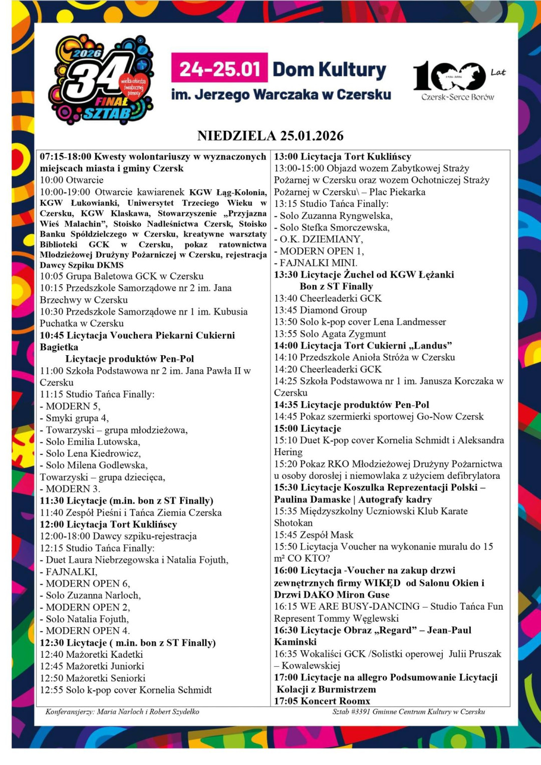 Licytacje na żywo oraz internetowe, przejażdżki wozem strażackim oraz występy artystów. To niektóre z atrakcji jutrzejszego (25.01) finału Wielkiej Orkiestry Świątecznej Pomocy w Czersku. Główną bazą sztabu będzie Dom Kultury w Czersku. Tu też odbędzie się większość licytacji i występów. W sieci trwa już kilka licytacji, w tym kolacji z burmistrzem, obrazu Jean Paula Kaminskiego oraz koszulki z podpisami polskich siatkarek.