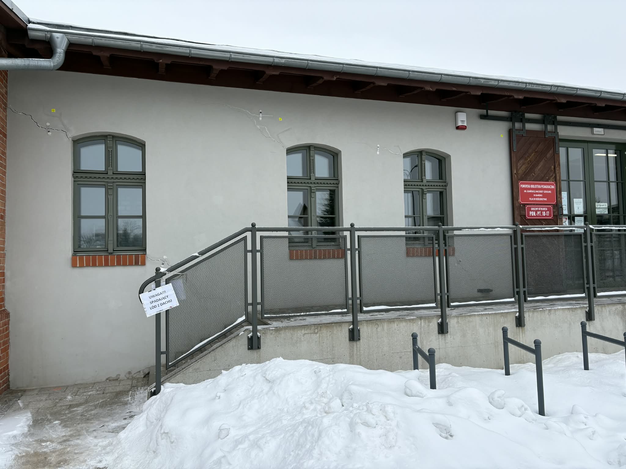 Na ścianach niedawno odrestaurowanego budynku przylegającego do dworca PKP w Kościerzynie pojawiły się pęknięcia. Chodzi o zabytkowy magazyn towarowy, w którym funkcjonuje filia Pomorskiej Biblioteki Pedagogicznej. Pęknięcia są widoczne m.in. nad oknami, przy parapetach, a także w pobliżu stropu. Może być ich około 30.