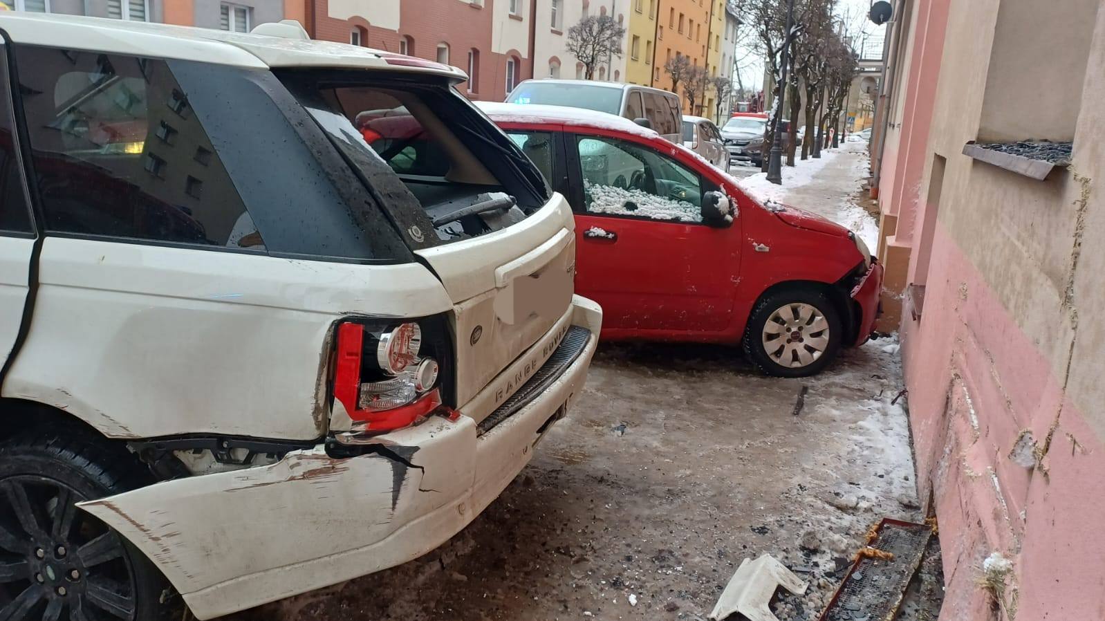 Kolizja na ul. Drzymały w Chojnicach. Auto osobowe uderzyło w budynek wielorodzinny i inne pojazdy